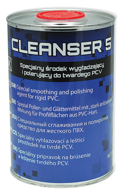 Cleanser 5 służy do polerowania i wygładzania powierzchni PCV w branży stolarki okiennej. Dzięki swojej silnej rozpuszczalności, środek ten skutecznie usuwa wszelkie zadrapania, rysy lub ślady otarcia na twardym PCV, PS, ABS.